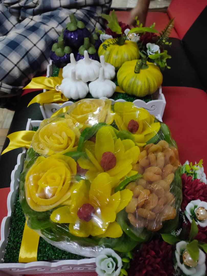 Makanan.contohnya jika anda inginkan 9 dulang hantaran jadi 3 hantaran boleh dalam .